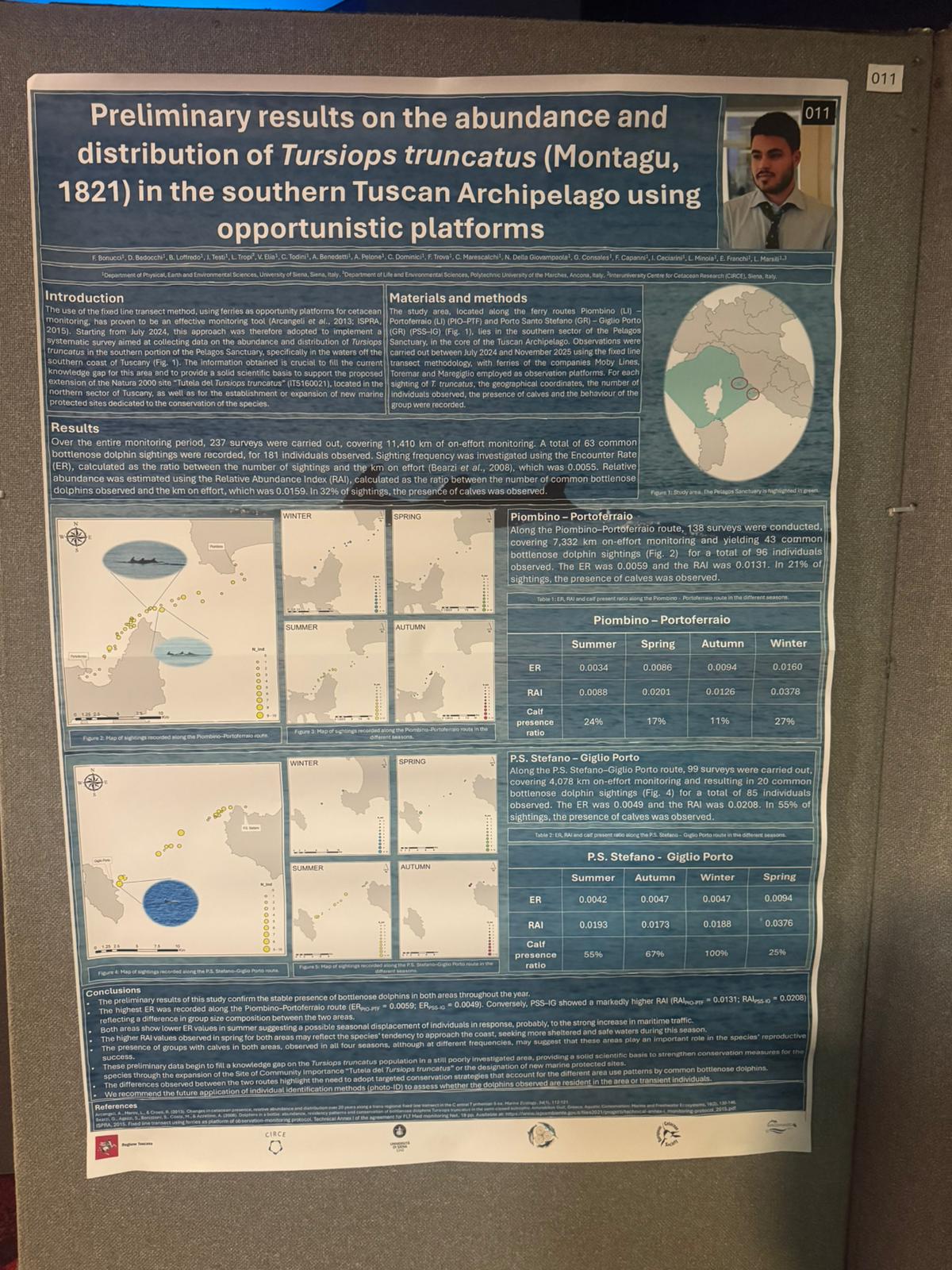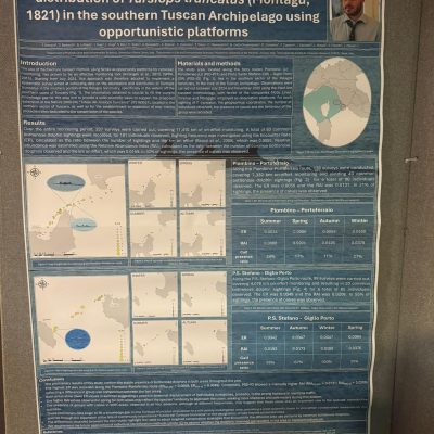 Il nostro borsista Lorenzo Minoia ha presentato il poster del dottorando Francesco Bonucci dal titolo “Preliminary results on the abundance and distribution of Tursiops truncatus (Montagu, 1821) in the southern Tuscan Archipelago using opportunistic platforms”.